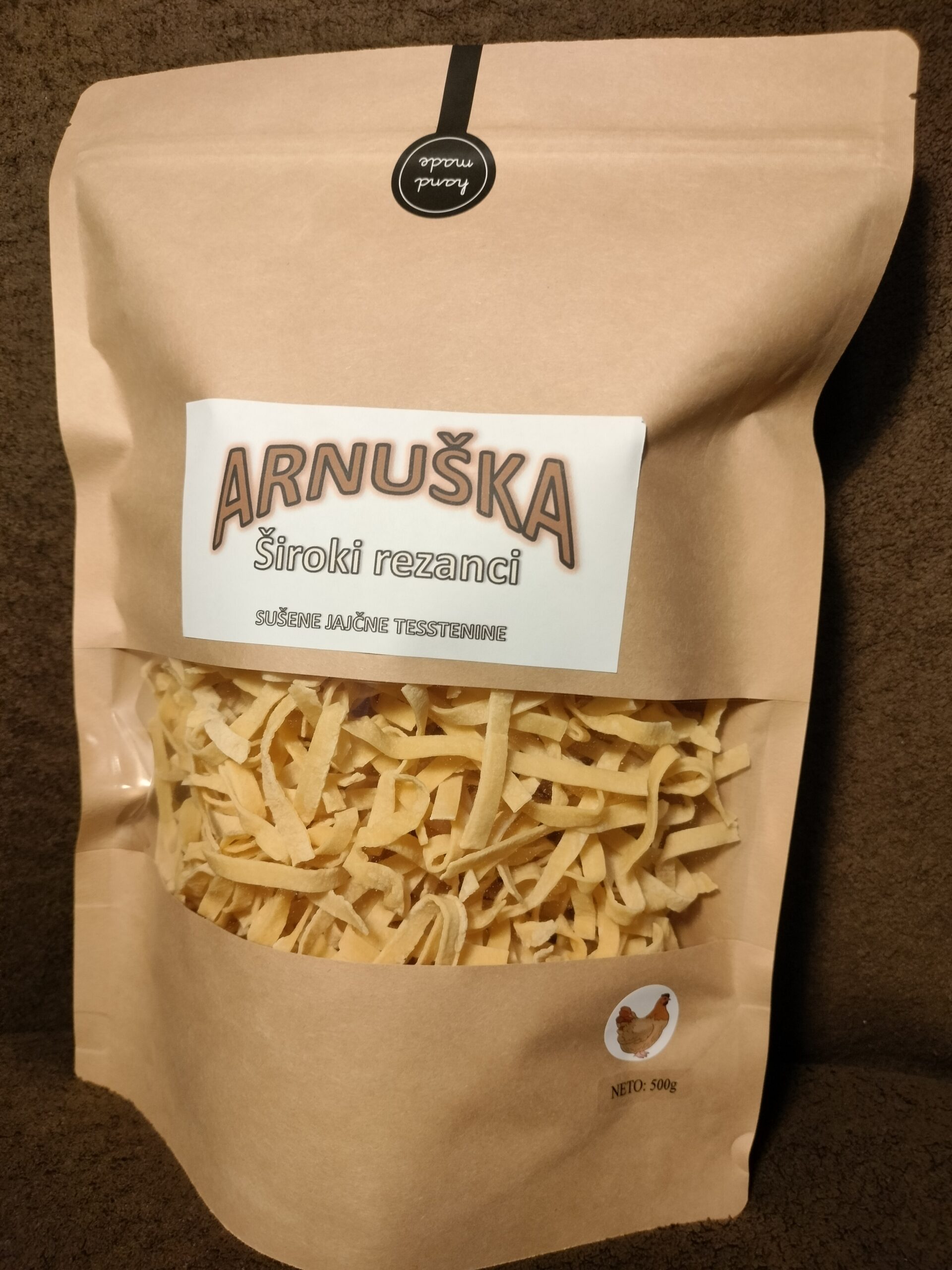 Široki rezanci Arnuška so ustvarjeni za kuharje, ki cenijo preprosto domačo hrano in kakovostne sestavine. Izdelani so iz kakovostne pšenične moke ter domačih jajc, kar jim daje lepo rumeno barvo, nežno teksturo in tisti pravi, pristni okus domačih testenin. Njihova široka oblika je popolna za vsakodnevne jedi – od omak na osnovi masla, smetane in zelenjave, do bogatejših nedeljskih obrokov. Rezanci se med kuhanjem lepo obnašajo, ostanejo čvrsti in ravno prav mehki, da v jedi zasijejo kot glavni element. Široki rezanci Arnuška združujejo domačnost, tradicijo in preprosto uživanje v vsakdanji kuhinji.